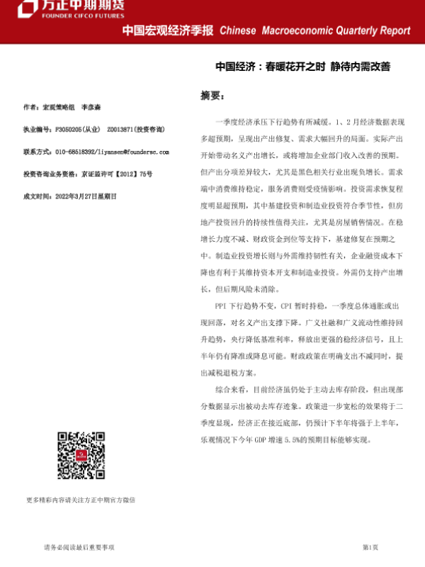 【方正中期期货】【20220327】中国宏观经济季报-25页