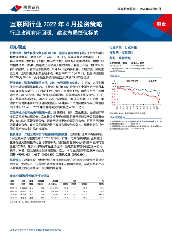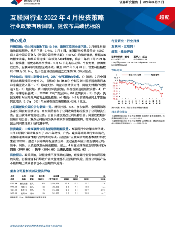 【国信证券】【20220401】互联网行业2022年4月投资策略:行业政策有所回暖,建议布局绩优标的-19页