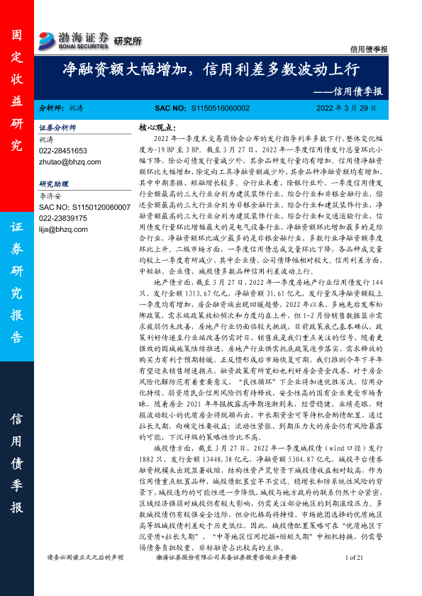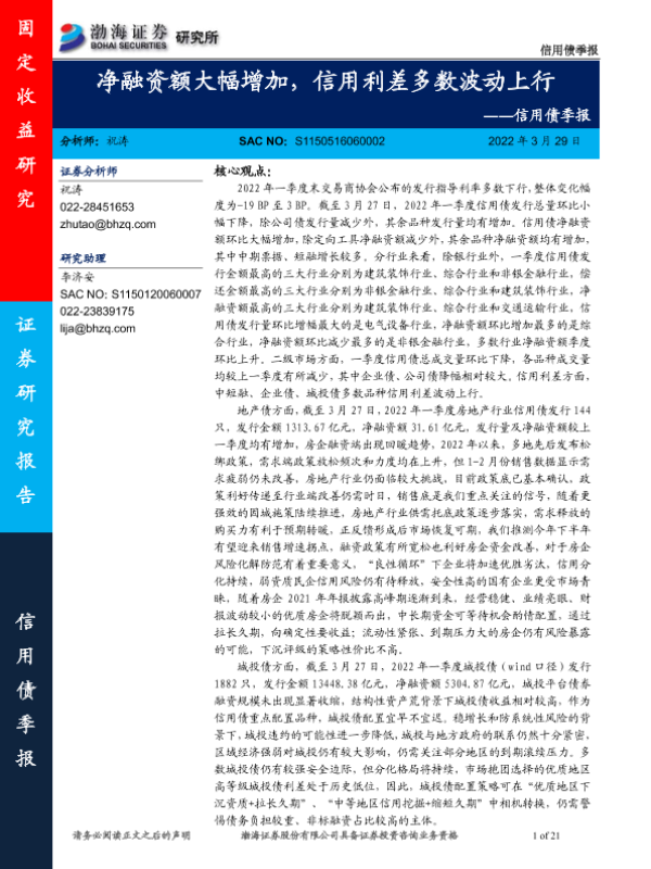 【渤海证券】【20220329】信用债季报:净融资额大幅增加,信用利差多数波动上行-21页