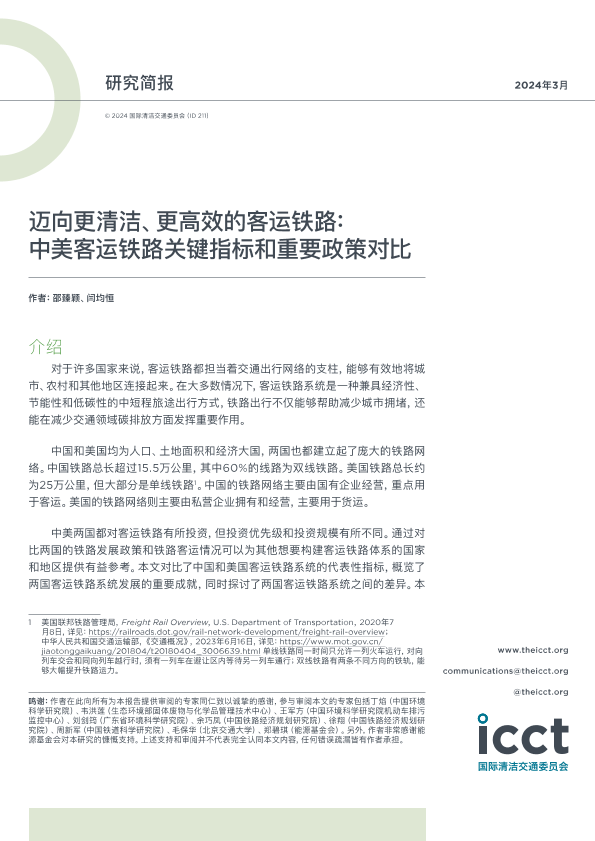 【国际清洁交通委员会(ICCT)】【202403】2024迈向更清洁、更高效的客运铁路:中美客运铁路关键指标和重要政策对比(中文版)-13页