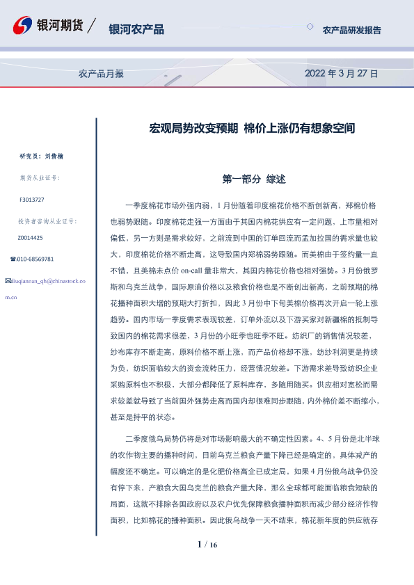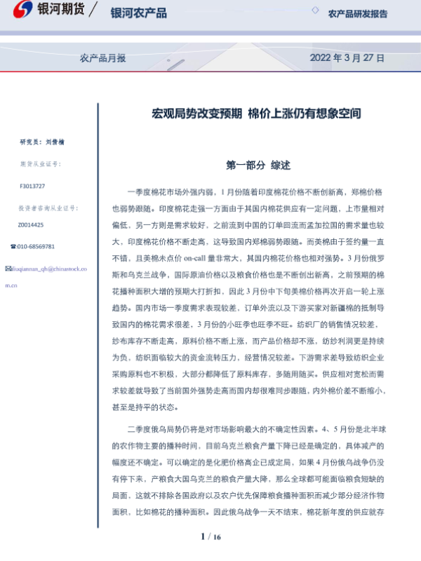 【银河期货】【20220327】农产品月报:宏观局势改变预期,棉价上涨仍有想象空间-16页