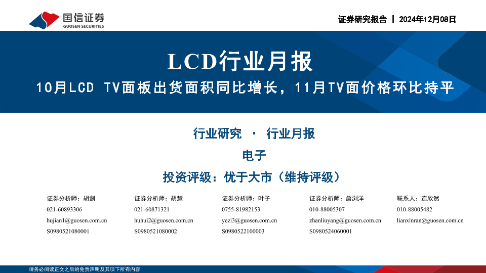 【国信证券】【20241208】2024年12月17日更新-【国信证券】LCD行业月报:10月LCD+TV面板出货面积同比增长,11月TV面价格环比持平-22页