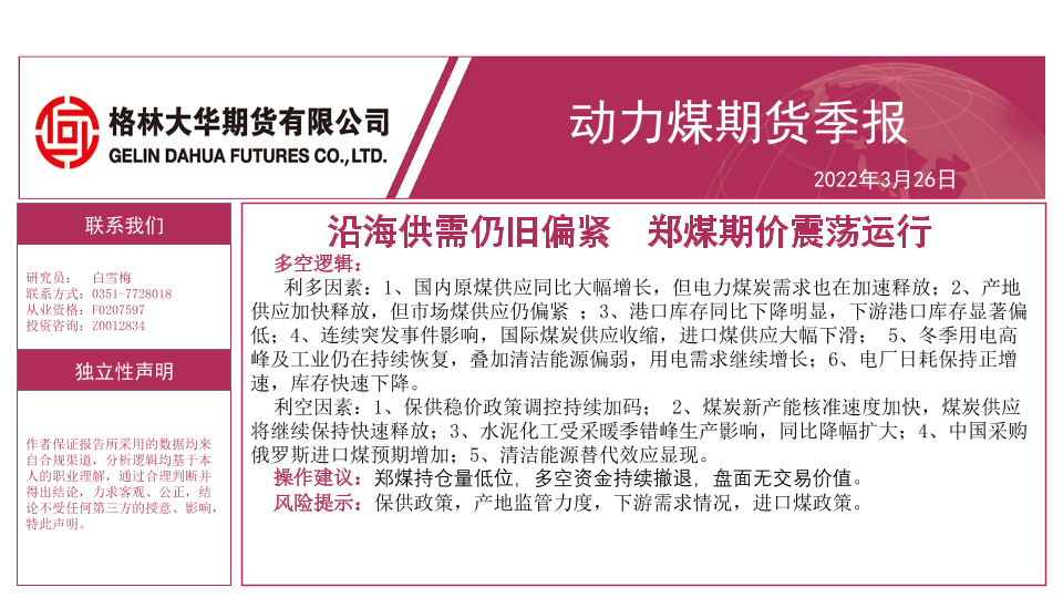 【格林大华期货】【20220326】动力煤期货季报:沿海供需仍旧偏紧,郑煤期价震荡运行-27页