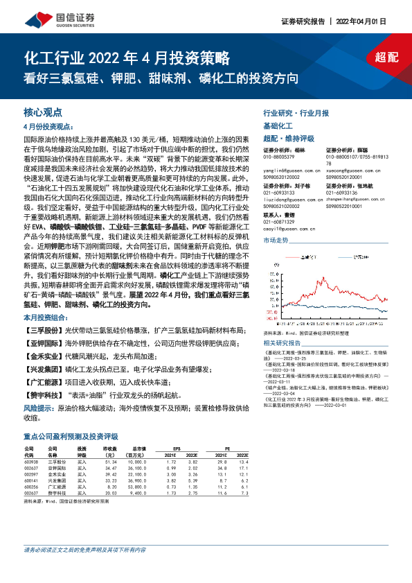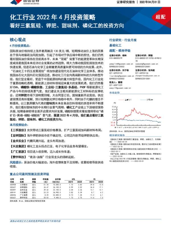 【国信证券】【20220401】化工行业2022年4月投资策略:看好三氯氢硅、钾肥、甜味剂、磷化工的投资方向-20页