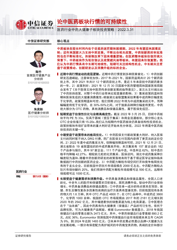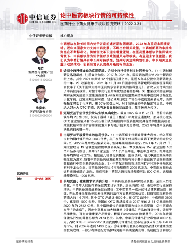 【中信证券】【20220331】医药行业中药大健康子板块投资策略:论中医药板块行情的可持续性-21页