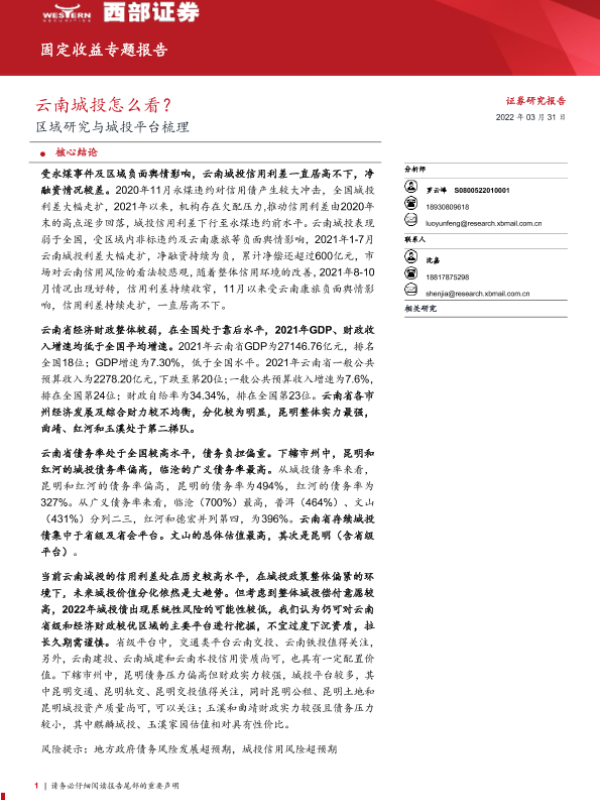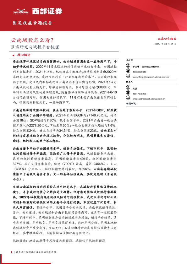 【西部证券】【20220331】固定收益专题报告:区域研究与城投平台梳理,云南城投怎么看?-17页