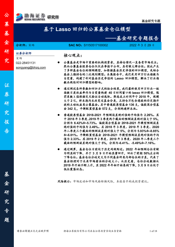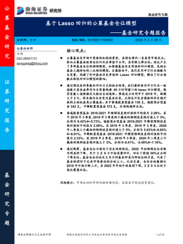 【渤海证券】【20220329】基金研究专题报告:基于Lasso回归的公募基金仓位模型-18页
