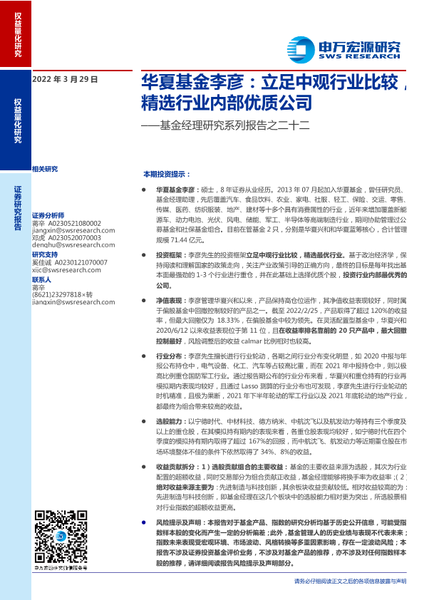 【申万宏源】【20220329】基金经理研究系列报告之二十二:华夏基金李彦,立足中观行业比较,精选行业内部优质公司-20页