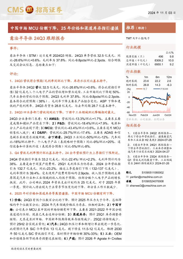 【海通证券】【20241113】2024年11月13日更新-【招商证券】电子行业意法半导体24Q3跟踪报告:中国市场MCU份额下降,25年价格和渠道库存指引谨慎-11页