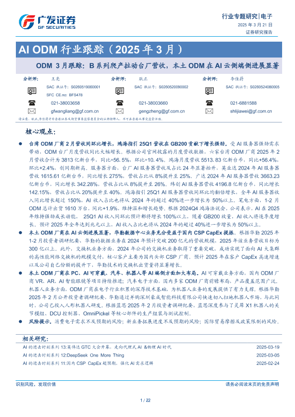 【广发证券】【20250401】AI+ODM行业跟踪(2025年3月) ODM3月跟踪,B系列爬产拉动台厂营收,本土ODM在AI云侧端侧进展显著-22页