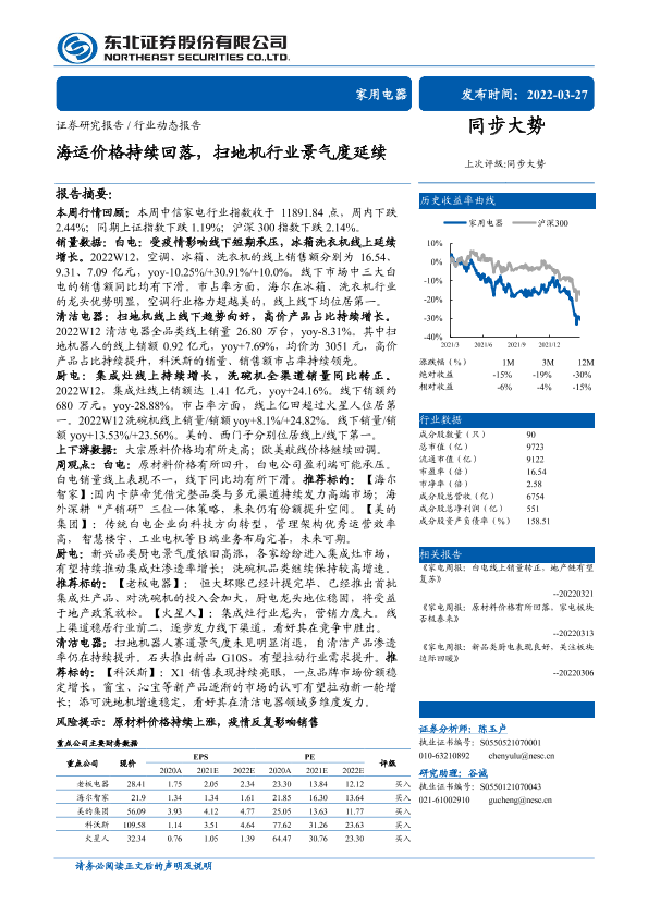 【东北证券】【20220327】家用电器行业:海运价格持续回落,扫地机行业景气度延续-16页
