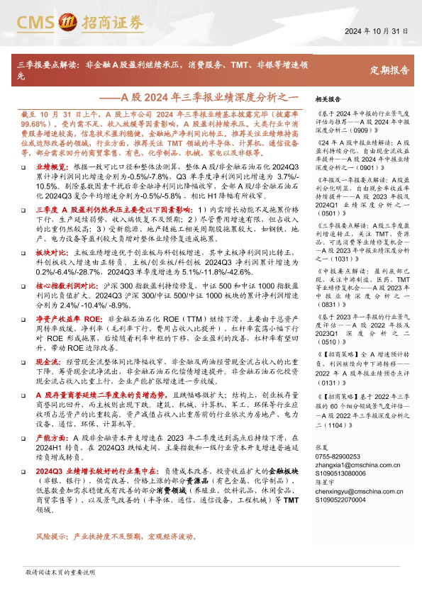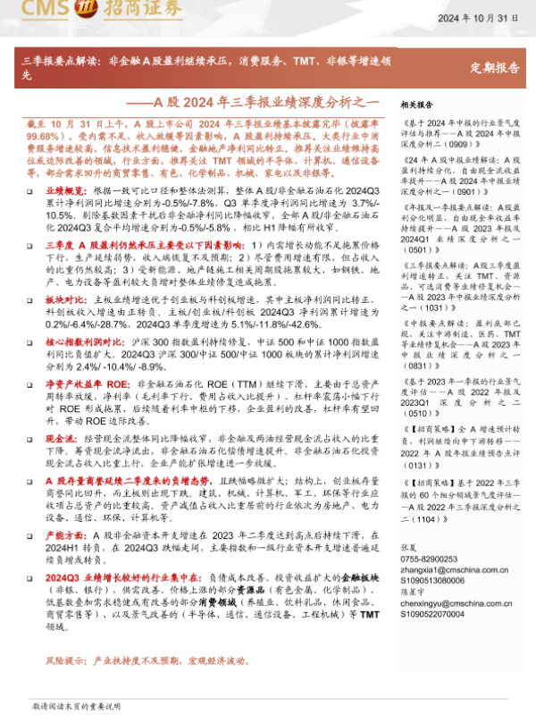 【海通证券】【20241105】2024年11月05日更新-【招商证券】A股2024年三季报业绩深度分析之一-三季报要点解读:非金融A股盈利继续承压,消费服务、TMT、非银等增速领先-24页