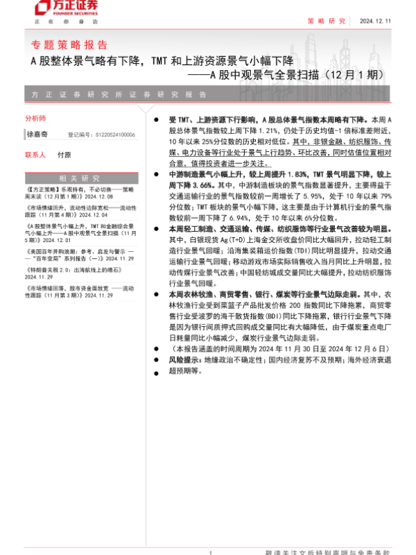 【方正证券】【20241217】A股中观景气扫描(12月第1期):A股整体景气略有下降,TMT和上游资源景气小幅下降-25页