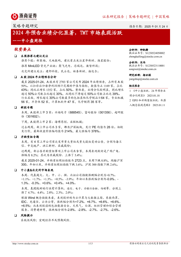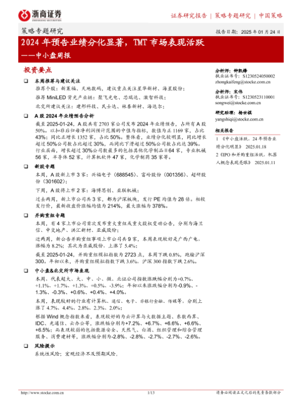 【浙商证券】【20250124】2024年预告业绩分化显著,TMT市场表现活跃——中小盘周报-13页