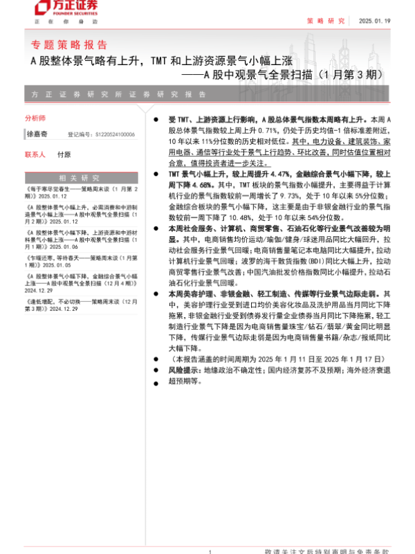 【方正证券】【20250129】A股中观景气全景扫描(1月第3期):A股整体景气略有上升,TMT和上游资源景气小幅上涨-25页