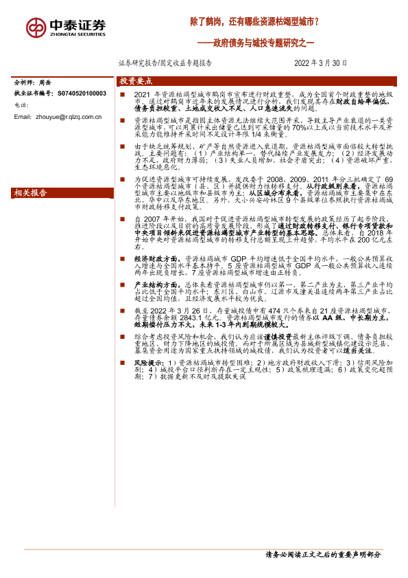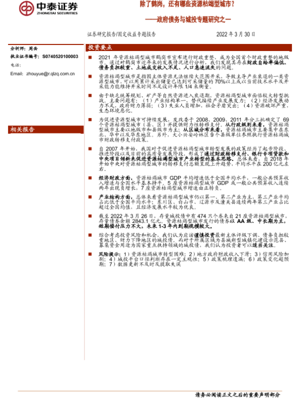 【中泰证券】【20220330】政府债务与城投专题研究之一:除了鹤岗,还有哪些资源枯竭型城市?-22页