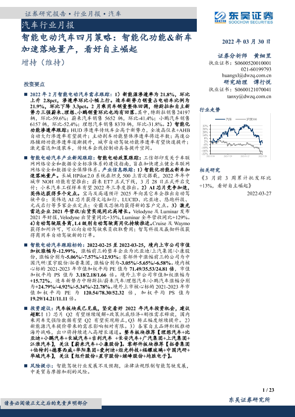 【东吴证券】【20220330】智能电动汽车行业四月策略:智能化功能&新车加速落地量产,看好自主崛起-23页