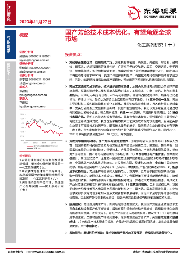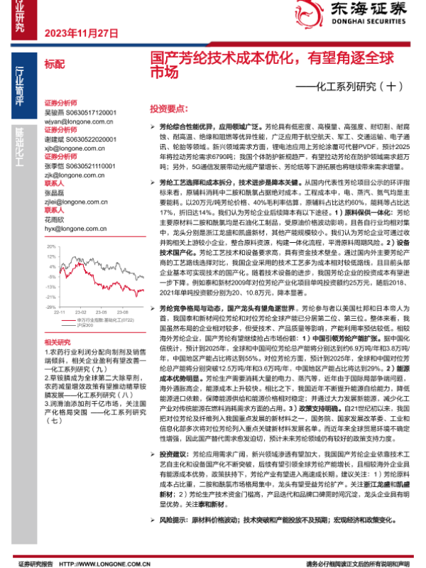 【东海证券】【20231127】国产芳纶技术成本优化,有望角逐全球市场——化工系列研究(十)-15页
