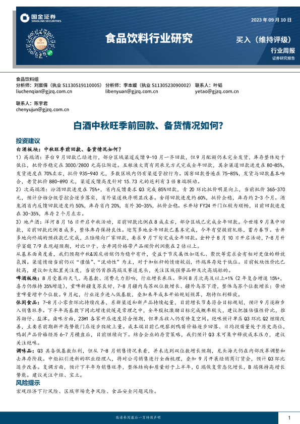 【国金证券】【20230911】2023年09月11日更新-【国金证券】食品饮料行业研究-白酒中秋旺季前回款、备货情况如何-11页