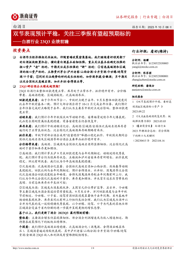 【浙商证券】【20231008】白酒行业23Q3业绩前瞻-双节表现预计平稳-关注三季报有望超预期标的-4页