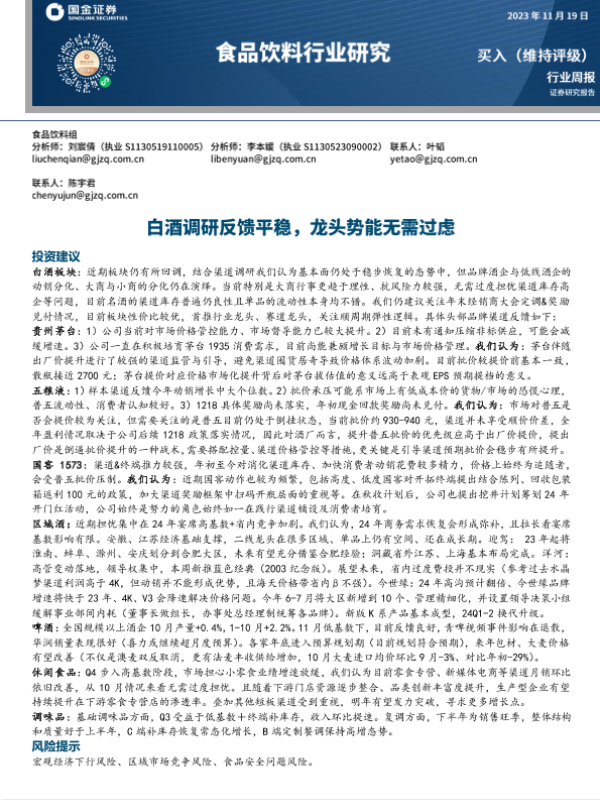 【国金证券】【20231120】2023年11月20日更新-【国金证券】食品饮料行业研究-白酒调研反馈平稳-龙头势能无需过虑-12页