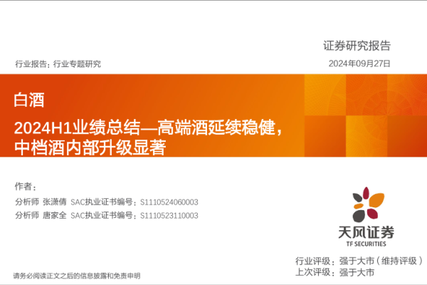 【天风证券】【20240927】2024年09月30日更新-白酒2024H1业绩总结:高端酒延续稳健中档酒内部升级显著-25页