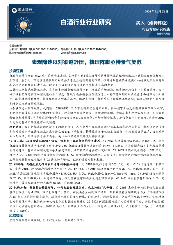 【国金证券】【20241112】2024年11月12日更新-【国金证券】白酒行业研究:表观降速以对渠道舒压,梳理阵脚亟待景气复苏-20页