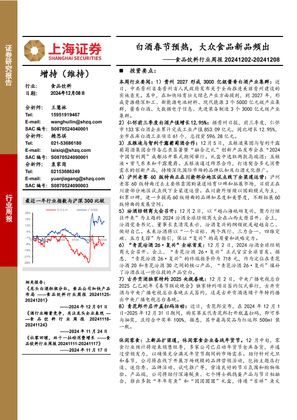 大众食品 新品发布 春节促销 行业周报 白酒