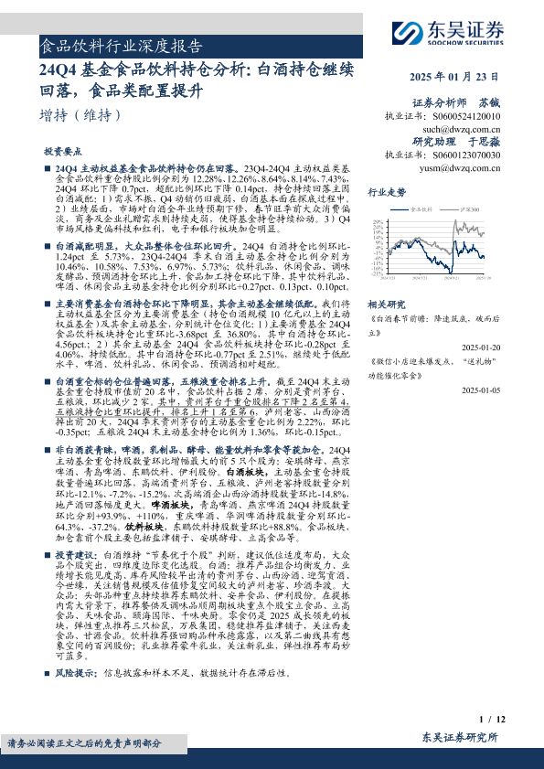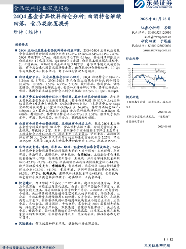 【东吴证券】【20250123】24Q4基金食品饮料持仓分析:白酒持仓继续回落,食品类配置提升-12页