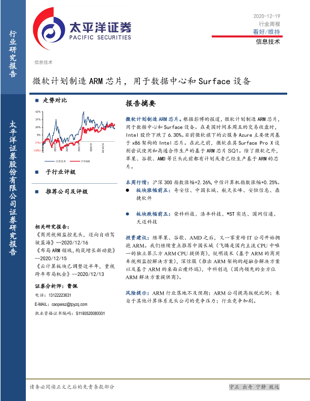 【太平洋证券】【20201219】微软计划制造ARM芯片,用于数据中心和Surface设备-20页