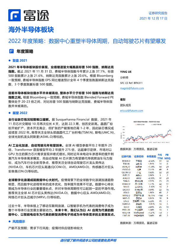 【富途证券】【20211217】2022年度策略:数据中心重塑半导体周期,自动驾驶芯片有望爆发-14页