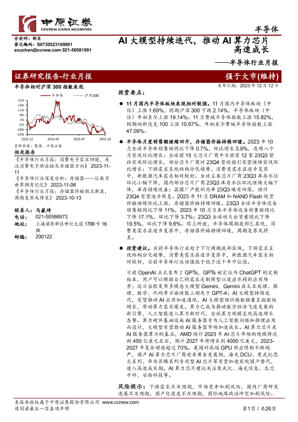 【中原证券】【20231212】2023年07月26日更新-半导体行业月报:AI大模型持续迭代,推动AI算力芯片高速成长-26页