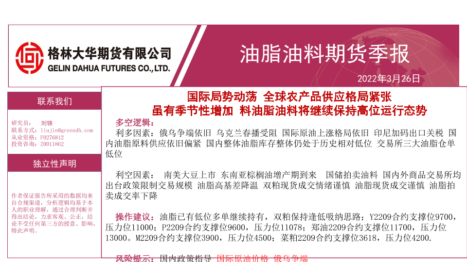 【格林大华期货】【20220326】油脂油料期货季报:国际局势动荡,全球农产品供应格局紧张,虽有季节性增加,料油脂油料将继续保持高位运行态势-39页