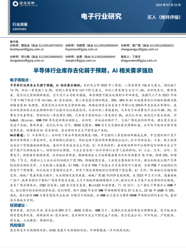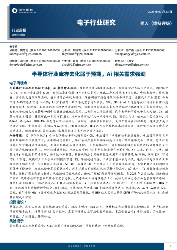 【国金证券】【20230724】2023年07月24日更新-【国金证券】电子行业研究-半导体行业库存去化弱于预期-Ai相关需求强劲-15页