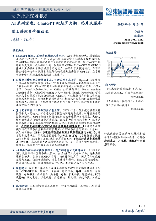 【东吴证券(香港)】【20230424】电子-AI系列深度:ChatGPT掀起算力潮,芯片及服务器上游投资价值凸显-5页