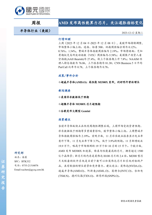 【国元国际】【20231212】2023年11月03日更新-半导体行业(美股):AMD发布高性能算力芯片,关注通胀指标变化-7页