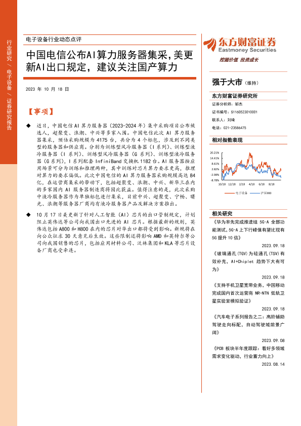 【东方财富证券】【20231018】2023年11月28日更新-电子设备-中国电信公布AI算力服务器集采,美更新AI出口规定,建议关注国产算力-3页