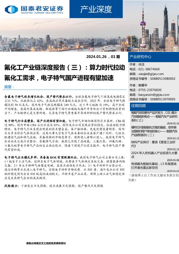 【产业研究中心】【20240126】2024年03月19日更新-氟化工产业链深度报告(三):算力时代拉动氟化工需求,电子特气国产进程有望加速-13页
