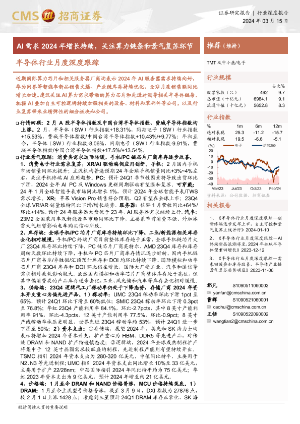 【海通证券】【20240315】2024年03月26日更新-半导体行业月度深度跟踪:AI需求2024年增长持续,关注算力链条和景气复苏环节-83页