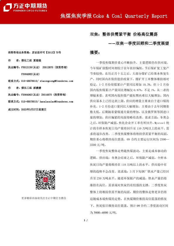 【方正中期期货】【20220327】焦煤焦炭季报-20220327-26页