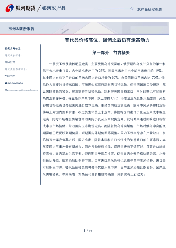 【银河期货】【20220329】玉米&淀粉报告:替代品价格高位、回调之后仍有走高动力-17页