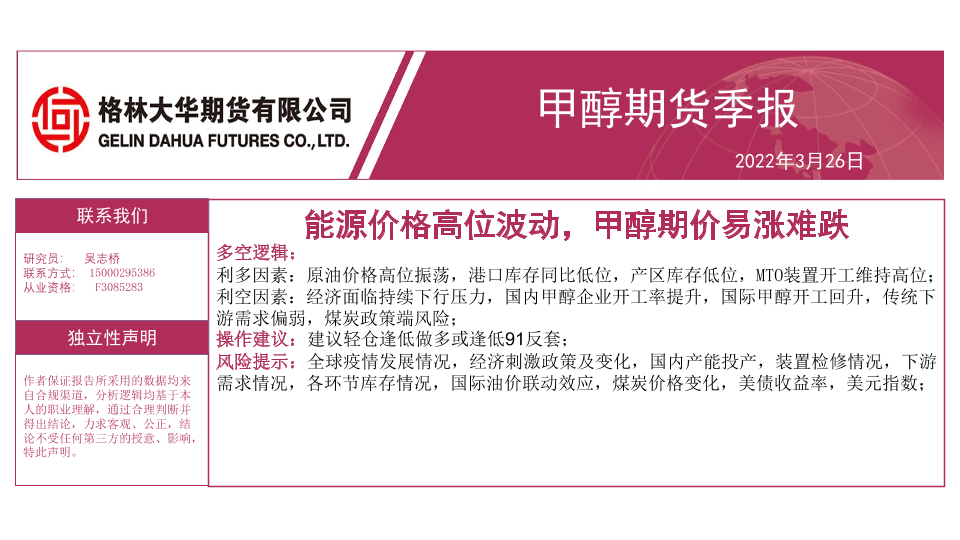 【格林大华期货】【20220326】甲醇期货季报:能源价格高位波动,甲醇期价易涨难跌-27页