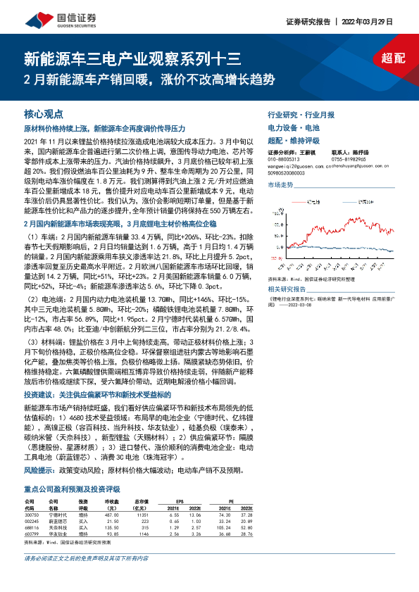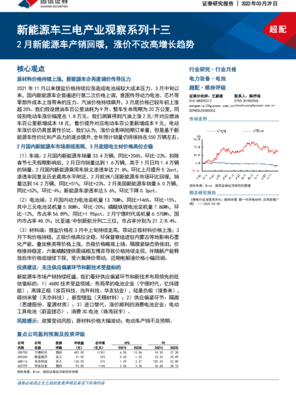 【国信证券】【20220329】电力设备·电池行业新能源车三电产业观察系列十三:2月新能源车产销回暖,涨价不改高增长趋势-28页