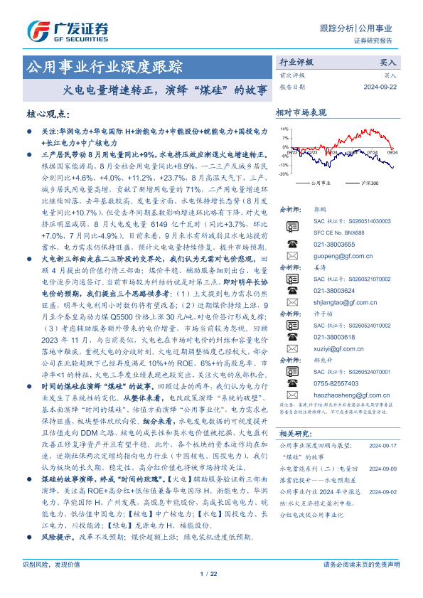 【广发证券】【20240922】2024年10月08日更新-【广发证券】公用事业行业深度跟踪:火电电量增速转正,演绎“煤硅”的故事-22页