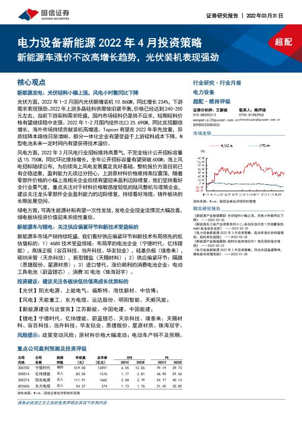 【国信证券】【20220331】电力设备新能源行业2022年4月投资策略:新能源车涨价不改高增长趋势,光伏装机表现强劲-29页