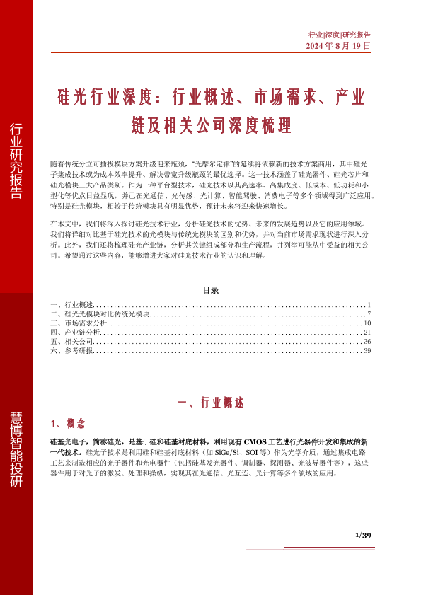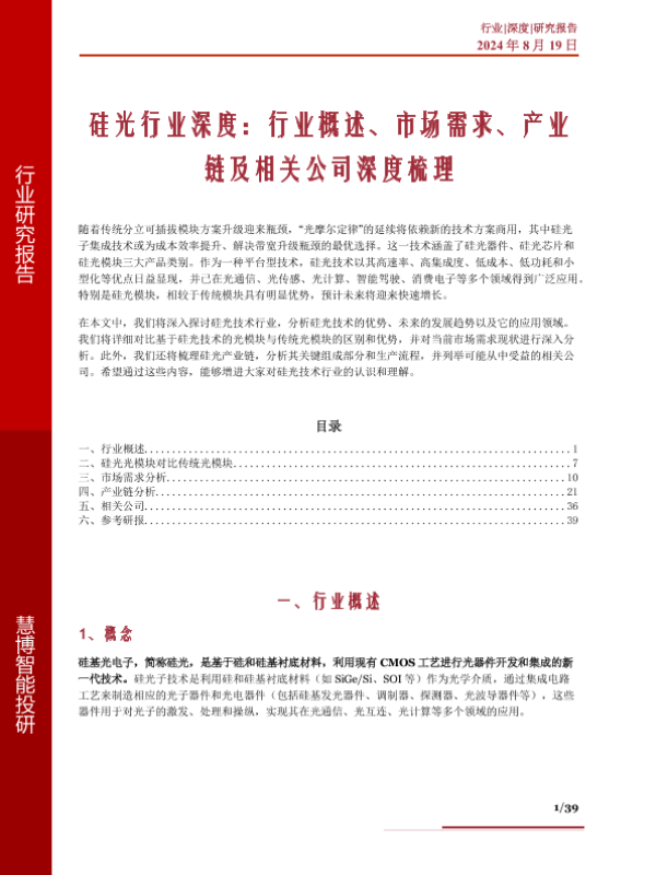 【慧博智能投研】【20240819】2024年10月09日更新-硅光行业深度:行业概述、市场需求、产业链及相关公司深度梳理-39页