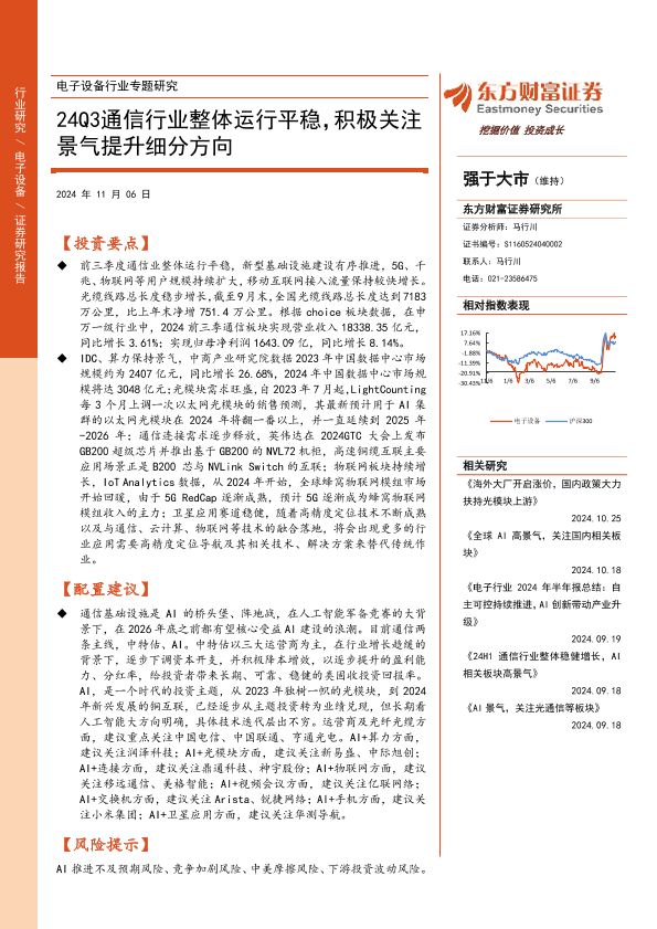 【东方财富证券】【20241106】24Q3通信行业整体运行平稳,积极关注景气提升细分方向-22页