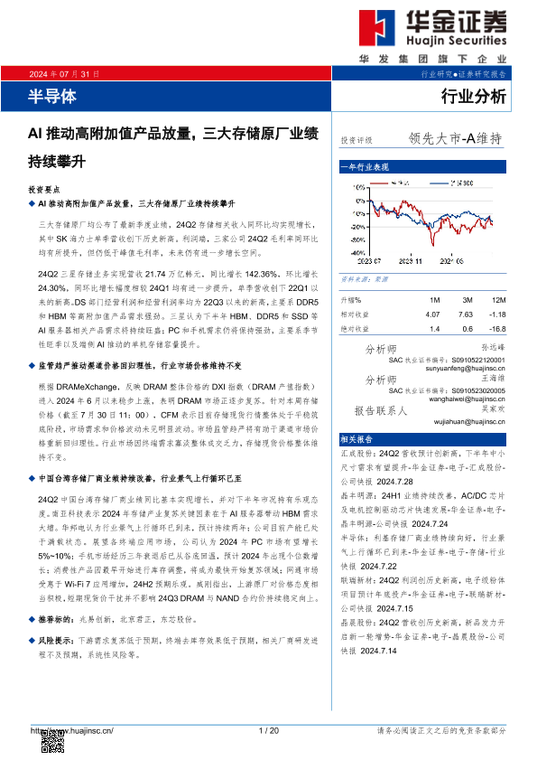【华金证券】【20240731】半导体:AI推动高附加值产品放量,三大存储原厂业绩持续攀升-20页