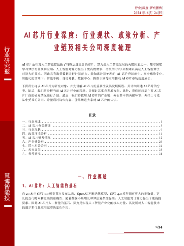 【慧博智能投】【20241119】2024年11月19日更新-AI芯片行业深度:行业现状、政策分析、产业链及相关公司深度梳理-34页