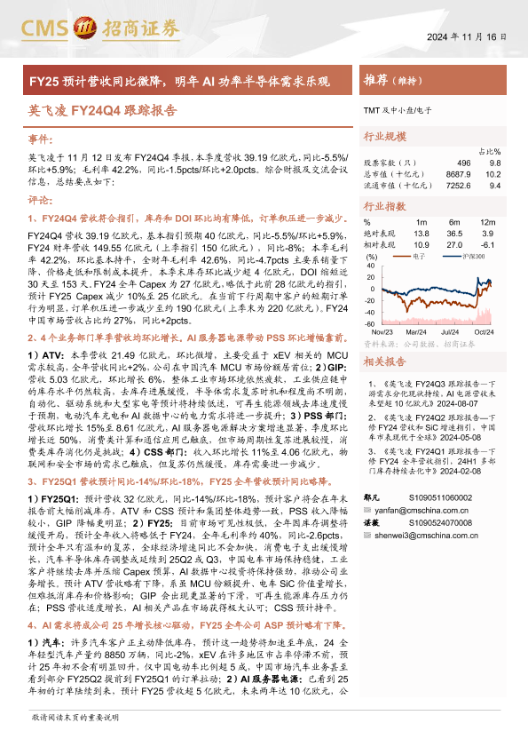 【海通证券】【20241128】电子行业英飞凌FY24Q4跟踪报告:FY25预计营收同比微降,明年AI功率半导体需求乐观-17页